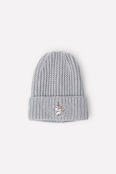Тёплая вязаная шапка в универсальном светло-сером оттенке для девочки. На отвороте прикреплена нашивка с надписью.