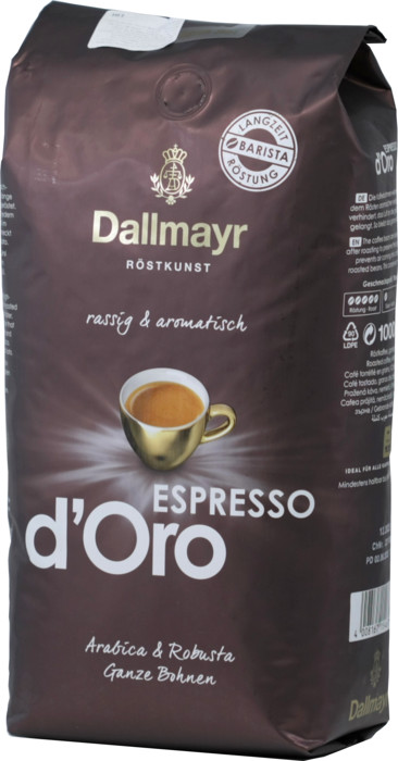 Натуральный зерновой кофе. Состав: арабика и робуста.Этот бленд собрал в себе отборные зерна арабики и робусты, которые были длительно и бережно обжарены в традиционном ростере барабанного типа. Сделав выбор в пользу d'Oro Espresso, вы сможете насладиться эспрессо с ярким и крепким характером с легкими оттенками какао. Характерной особенностью этого кофе является бархатистая легкая пенка крема.Интенсивность — 8 из 10. Обжарка зерен — темная.