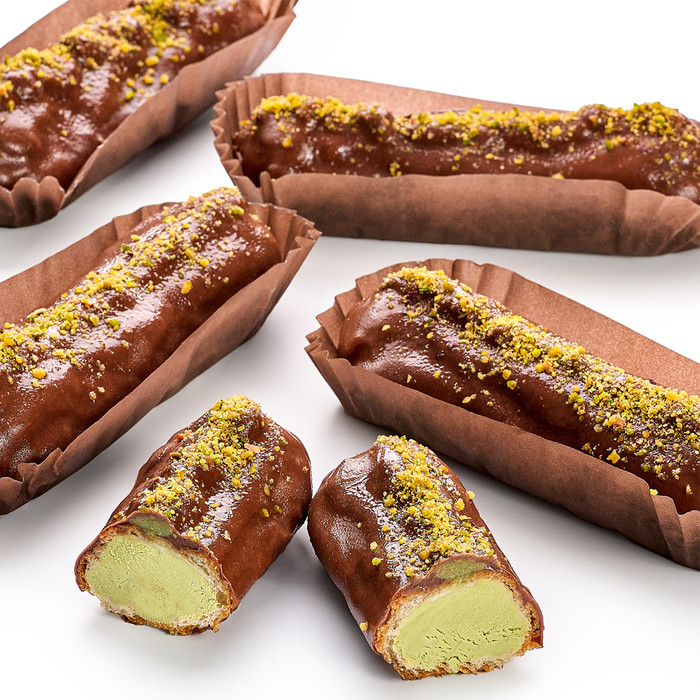 Эклеры с сырным кремом с натуральной фисташковой пастой и хрустящей фисташковой начинкой, декорированные шоколадной глазурью и дробленной фисташкой.