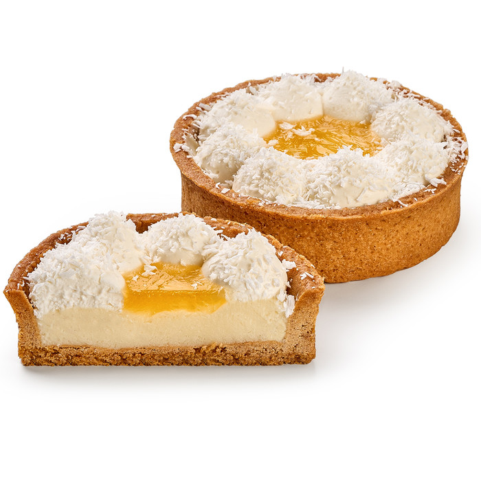 Песочная основа с легким заварным лимонным и сливочно-сырным кремом, декорированная кокосовой стружкой.