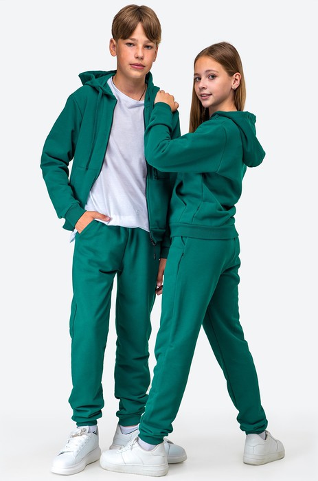 Однотонный костюм двойка изумрудного цвета для детей и подростков выполнен из трикотажа, который идеален для осени, весны и даже зимы. Хлопковый зеленый костюм хорошо тянется и держит форму даже после частых стирок благодаря добавлению полиэстера.