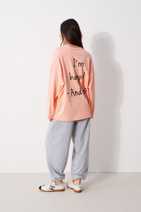 Джемпер прямого свободного кроя,выполнен из трикотажного полотна. Характеристики: прямой крой, овальный вырез горловины, горловины из довяза, спинка цельнокроеная, Принт "I'm happy! And you?", спущенное плечо, вточной длинный рукав. Длина по центру спинки 70 см, длина рукава от края горловины 76см.