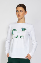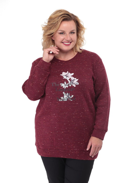 Удлиненный джемпер из трикотажной ткани с начесом,очень теплый. Плечо слегка спущенное, горловина округлой формы. Перед и спинка цельные,с притачной планкой по низу, по переду клеевая апликация. Рукав втачной, одношовный, с притачной манжетой. Длина по спинке 74 см, длина рукава от горловины 73 см, длина рукава от плечевого шва 55 см.