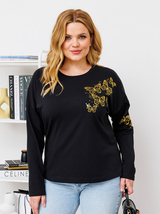 Трикотажный джемпер прямого силуэта. Рукав спущенный. По переду расположена печать в виде "летящих бабочек" .