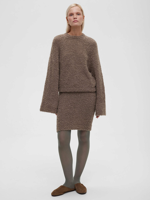 Джемпер с круглой горловиной и рукавами реглан выполнен из смесовой пряжи с альпакой и шерстью. Фактура букле создаёт живую, объёмную поверхность, за которую хочется зацепиться взглядом и прикосновением — она задаёт характер вещи и делает её визуально выразительной.