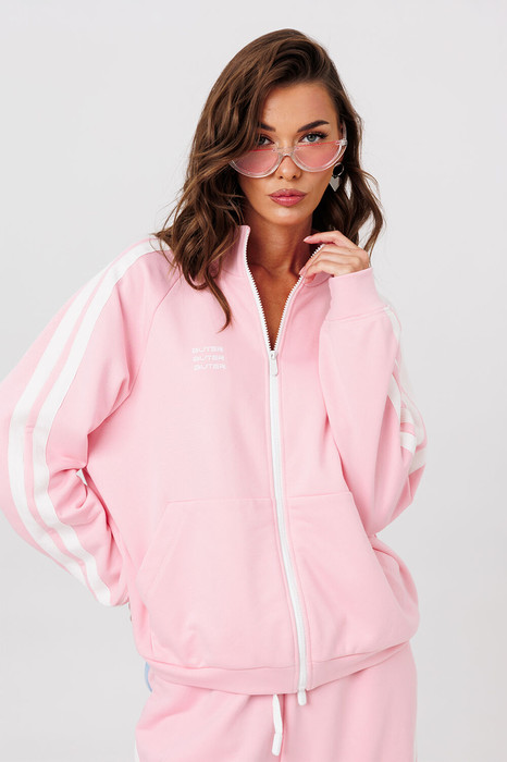 Джемпер трикотажный прямого силуэта с втачным длинным рукавом-реглан внизу на притачной манжете. Рукав с широкими настроченными лампасами. Полочка, с центральной застежкой на тесьму-молнию, карманом-кенгуру и печатью «BUTER». По низу джемпера притачная планка. Воротник-стойка. Джемпер без подкладки.