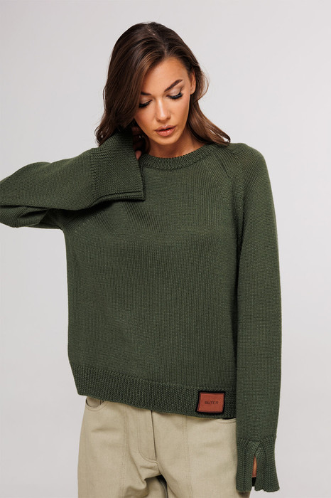 Джемпер трикотажный вязанный с длинным рукавом-реглан, по низу рукава планка с разрезом. По перу нашивка «BUTER». По горловине притачная планка из основного трикотажа, вырез горловины круглый.