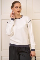 Джемпер трикотажный прямого силуэта со спущенной линией плеча и длинным рукавом. По переду отрезной бочек, в шов которого вставлен фастекс, благодаря чему у джемпера меняется силуэт и образуются дополнительные драпировки. По горловине притачная планка из основной ткани.