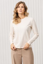 Лонгслив из тонкой трикотажной ткани . Полуприлегающего силуэта с втачным удлиненным рукавом. Горловина обработана бейкой. Низ изделия и низ рукавов обработан на плоскошовной машине.