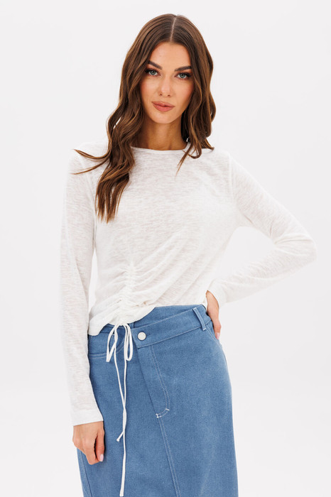 Полуприлегающий силуэт, втачной покрой, круглая горловина, длинный зауженный рукав. По низу джемпера с одной стороны декоративная сборка.