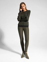 Джемпер прямого силуэта из трикотажного полотна. Перед с застежкой поло и нагрудными вытачками. По воротнику, низу изделия и низу рукава отстрочена декоративная строчка. Длина джемпера  - 61 см, длина рукава - 61 см.