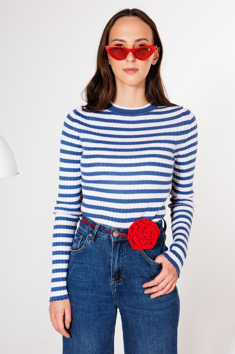 Универсальный джемпер из тонкой хлопковой пряжи. Он идеально прилегает к телу, позволяя носить его в прохладные дни как базовый слой с жакетами, кардиганами или пальто. Такая пряжа мягко греет и совсем не колется, а благодаря обработке волокон специальным составом джемпер долго не потеряет форму и не сядет при стирке. Благодаря полосатой расцветке - любой образ станет интереснее. Длина - 58 см.