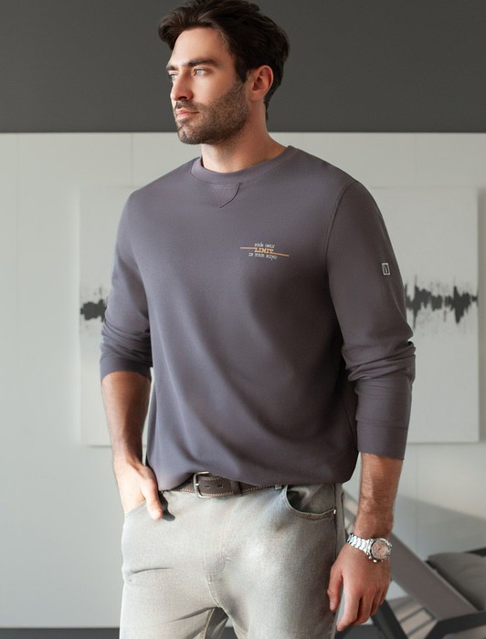 Состав: 80%Хлопок 20%ПЭ Плотность: 170 Г/м2 Параметры модели на первом фото: Рост 190, бюст 108, талия 87, бедра 104Легкий и невероятно комфортный джемпер серого цвета создан для повседневного образа. Мягкий фактурный эластичный трикотаж приятно ощущается на теле, не сковывает движения и отлично подходит для носки в любое время года. Полуприлегающий крой обеспечивает свободу и удобство, позволяя выглядеть стильно и чувствовать себя уверенно каждый день. Круглый ворот украшен декоративной нашивкой в виде перевернутого треугольника, добавляющей оригинальности.. Манжеты на рукавах и по низу аккуратно оформлены, что придает завершенность внешнему виду и способствует сохранению формы джемпера после длительной носки и многочисленных стирок. Принт в виде небольшой надписи добавляет яркости, подчеркивая индивидуальность каждого мужчины. Перевод надписи: Уour only limit is your mind - Твой единственный предел — твой разум.