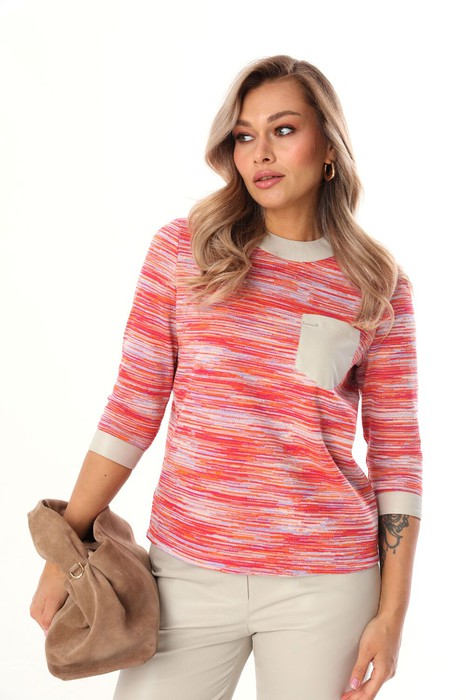 Трикотажный джемпер свободного кроя с укороченными рукавами. По переду расположен карман из мягкой экокожи. Горловина и манжеты низа рукавов декорированы экокожей. По переду нагрудные вытачки. Застёжка на потайную молнию по спинке. Длина джемпера 59-63 см