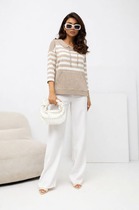 Джемпер полуприлегающего силуэта из трикотажного полотна в полоску. Воротник стояче-отложной, по центру застежка на петли и пуговицы. Рукав втачной, одношовный, выше линии локтя. Обращаем ваше внимание, что фурнитура может отличаться от фото.