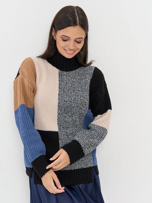 Совместные покупки Омск Женская одежда Джемперы, свитеры, водолазки — Джемпер NewVay 7242-40254 чёрный/джинс/чёрный-молоко/ ваниль/ристретто