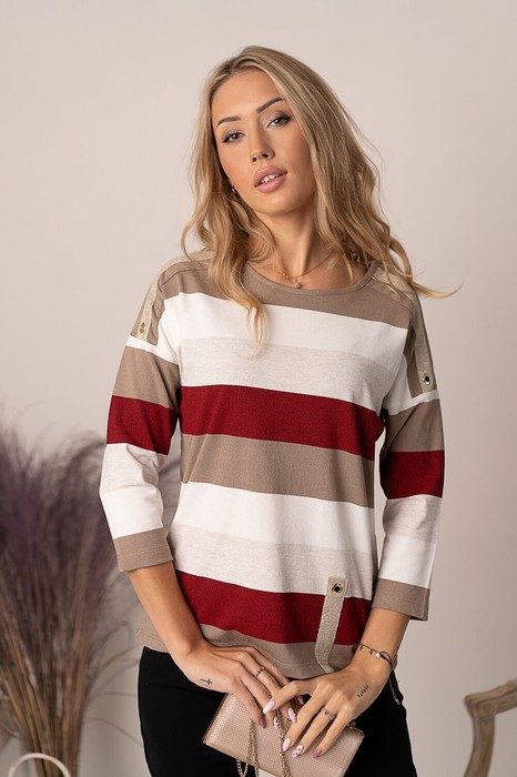 Особенность модели в рукавах 3/4 со спущенной линией плеча. Украшено декоротивной тесьмой с люверсами. Горловина округлая, зрительно вытягивает шею. Свободного кроя. Прекрасно сочетается с джинсами, кюлотами, подходит под офисные юбки и брюки.