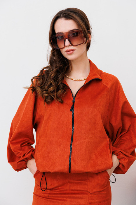 Джемпер объема оверсайз  прямого силуэта. По полочке и спинке вертикальные рельефы. Рукав длинный, широкий, покроя реглан. Воротник-стойка. Застежка центральная на молнию. По низу изделия протянут эластичный шнур с фиксатором.