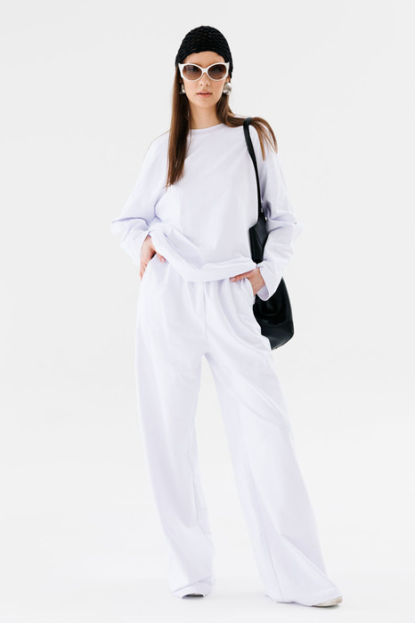 Джемпер свободного силуэта с округлой горловиной. Рукав комбинированного кроя, с передними и задними швами. Верхняя и нижняя часть рукава образуют между собой разрез. По спинке изделие декорировано авторским вязаным элементом ручной работы.