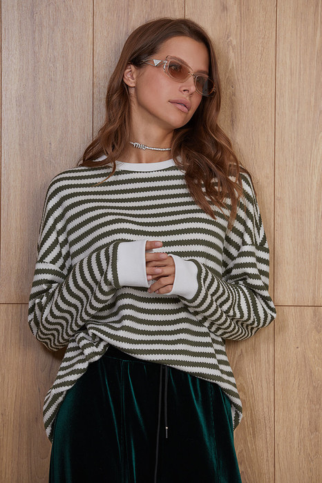 Свитшот свободного силуэта - "Oversize", выполнен из трикотажного вискозного полотна полоску. Спущенная линия плеча. Рукав длинный. Низ рукава на притачной манжете, которая выполнена из отделочной ткани. Спина прямая. Горловина круглая, с притачной планкой, выполненной из отделочной ткани (довяз).