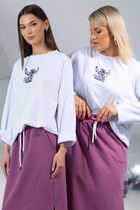 Стильный универсальный мягкий свитшот из нежного трикотажа. Модель свободной формы полуприлегающего силуэта, с овальным вырезом горловины, со спущенным плечом. Горловина обработана планкой из основной ткани. Перед модели декорированы дизайнерской вышивкой.