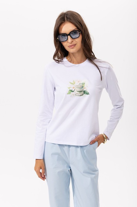 Дизайн: длинный джемпер с круглым вырезом горловины и длинными рукавами. Яркий принт в виде макарон с цветочным акцентом придаёт изделию оригинальность и игривость;