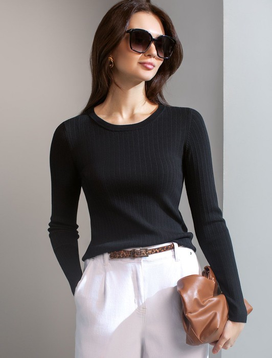 Состав: 83%Вис 17%ПА Плотность: 12 GG Размер товара на первом фото: 42Джемпер тонкой вязки выполнен из вискозы с нейлоном. Для производства изделия использована пряжа сердечникового прядения — когда нейлоновая нить (основа) обвивается вискозой. Вискоза обеспечивает приятную тактильность и гигроскопичность, а нейлон предотвращает растяжение и повышает устойчивость к пилингуемости. Модель прилегающего кроя безупречно сидит по фигуре не сковывая движений. Изделие дополнено фирменным металлическим логотипом бренда.