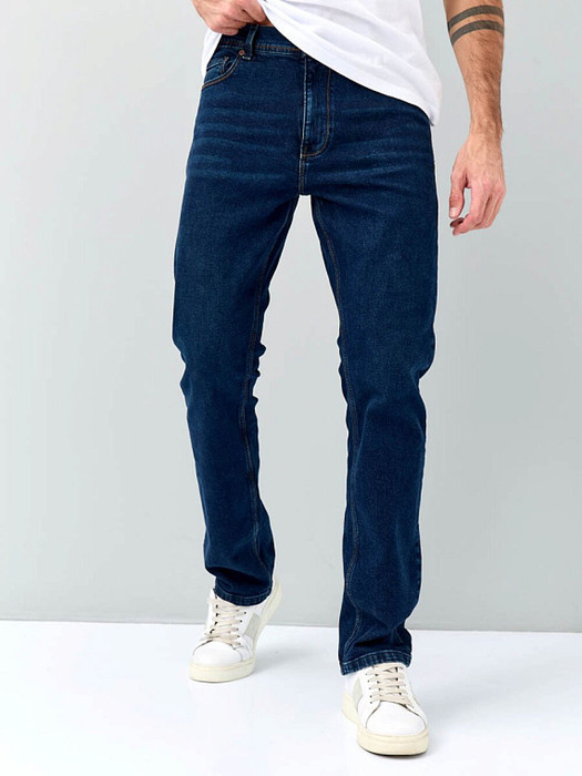 Мужские классические джинсы с пятью карманами. Посадка Regular fit (полуоблегающие по бедру), высокая талия. Застежка на молнии. Зауженные к низу.  Выполнены из слабоэластичной ткани denim comfort stretch. Средняя стирка с  потёртостями и "усами" спереди и потёртостями сзади. Параметры указаны для размера 32. Длина внутреннего шва - 83,5 см.