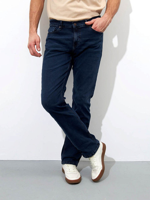 Мужские классические джинсы с пятью карманами. Посадка Slim fit (облегающие по бедру), средняя высота талии. Застежка на молнии. Немного зауженные к низу. Выполнены из эластичной ткани denim stretch, цвет ткани Blue/Black(лицевая сторона ткани темно-синяя, изнаночная сторона- черная). . Темная стирка "stone wash" со слабовыраженными потертостями и "усами" спереди и потёртостями сзади.