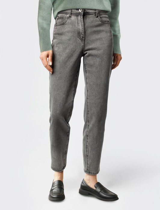 Состав: 94%Хлопок 6%ПУ Плотность: 14.5 OZ Параметры модели на первом фото: Рост 172, бюст 88, талия 64, бедра 88Джинсы mom-fit светло-серого цвета выполнены из эластичного денима. Лаконичная модель с легкой стиркой хорошо впишется в непринужденный повседневный образ с вещами и нейтральной, и яркой гаммы. Комфортная посадка на талии подходит для любой фигуры, ткань хорошо тянется и не сковывает движений. Изделие дополнено классической задней нашивкой из бежевой эко-кожи с логотипом бренда.