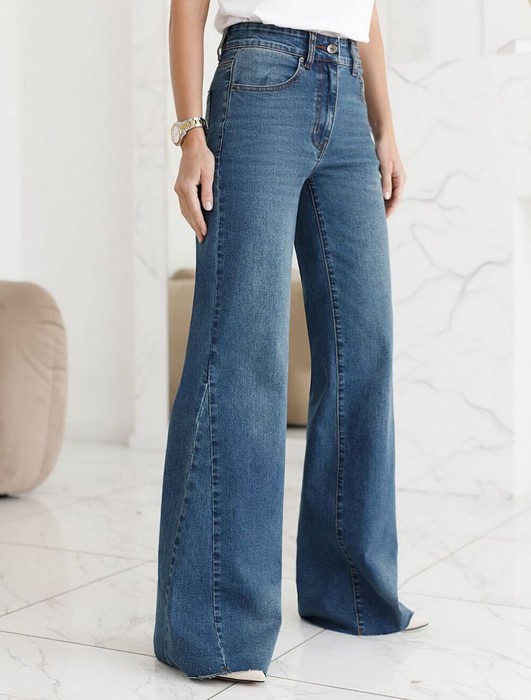 Джинсы клеш от колена расширенные к низу синего цвета выполнены из эластичного денима плотностью 14,8 OZ, который отлично тянется и мягко садится по фигуре. Эластичный материал дарит свободу движений, а облегченная ткань делает эти джинсы идеальным выбором на каждый день. Клеш от колена выгодно вытягивает силуэт, визуально удлиняет ноги и подчеркивает округлые бедра, создавая женственный образ без лишних усилий. Джинсы подходят на большие размеры, позволяя чувствовать себя уверенно, специальный крой выгодно выделяет достоинства и мягко маскирует возможные нюансы фигуры.
