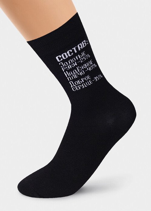 Мужские носки с надписью "Состав: золотые руки - 25%, надежное плечо - 40%, доброе сердце - 35%".