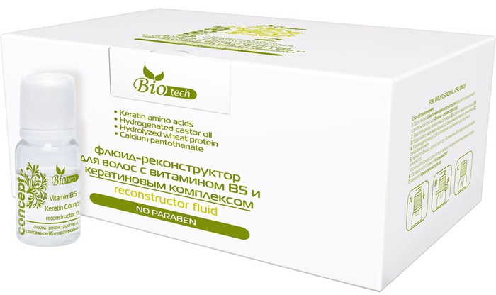 Флюид-реконструктор насыщает структуру волоса необходимыми аминокислотами. Обладает хорошей проникающей способностью. Витамин В5 в сочетании с Кератиновым комплексом усиливает процесс регенерации, оживляет структуру, оказывая мгновенное восстанавливающее действие. Способствует регенерации поврежденных волос на глубинном уровне.