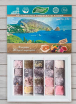 Жевательные конфеты с витамином С, со вкусом вишни. Состав сироп глюкозы, сахар, растительные жиры (пальма, кокос, пальмовое ядро), желатин, подкислитель (лимонная кислота),  порошок плодов вишни (0,5%), витамин С, натуральный ароматизатор, краситель [бетанин (свекла)]. Пищевая ценность 100 г Энергетическая ценность 1692 кДж/401 ккал Жиры 8,50 г из них насыщенные жирные кислоты 5,70 г Углеводы 79 г из них сахар 50 г Белок 2 г Соль (=натрий х 2,5) 0,01 г