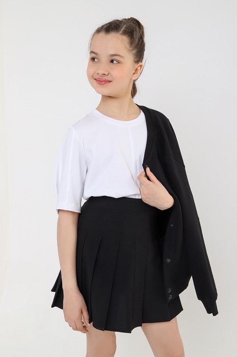 Футболка для девочек модной объемно-силуэтной формы, с вертикальным отстроченным швом по центру переда. На рукавах также выполнены декоративные вертикальные отстроченные швы и глубокие защипы по низу.