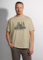 Футболка мужская из гладкокрашеного трикотажного полотна "кулирка" с лайкрой, классическогоь покроя, с коротким втачными рукавами, горловиной овальной формы, обработанной втачной планкой и принтом на полочке, выполненным в технике шелкографии.
