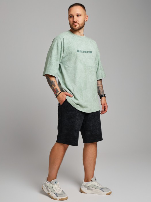 Футболка мужская из трикотажного полотна "кулирка-варенка", с удлиненными плечевыми швами, втачными короткими рукавами, горловиной овальной формы, обработанной втачной планкой, и принтом на детали переда, выполненным в технике шелкографии. По горловине изделия настрочена отделочная строчка.