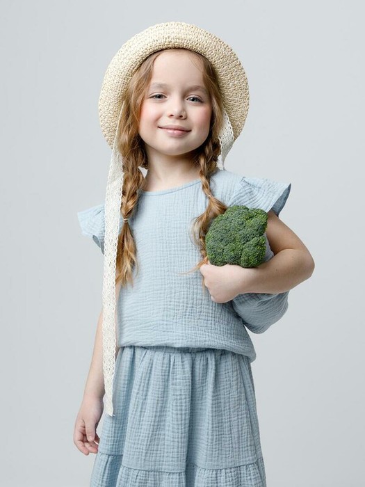 Укороченный топ для девочки из мягкого хлопокового муслина. По спинке застежка на кнопки. Изделие сохраняет цвет, форму и фактуру жатости после многократных стирок.