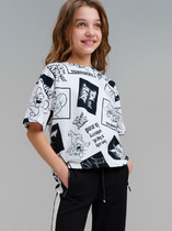 Яркая трикотажная футболка с блестящим принтом на груди и декоративными оборками по бокам. Прямой крой, круглый вырез горловины.На ребенке представлен размер 110:- Ширина изделия по линии груди 36,5 см- Ширина по низу изделия 34,5 см- Длина изделия 39,5 смРазница между размерами составляет 1,5 см.