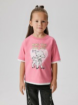 Трикотажная футболка, декорированная контрастным прорезиненным принтом с деталями из блесток и пайеток спереди. Свободный крой, круглый вырез горловины, слегка удлиненная спинка.На ребенке представлен размер 140:- Ширина изделия по линии груди 41 см- Ширина по низу изделия 40 см- Длина изделия 53 смРазница между размерами составляет 1,5 см.