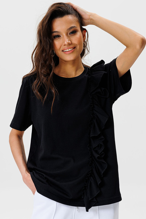 В этой футболке с воланом от GOwear вы не останетесь незамеченной! Вы легко сможете собрать много стильных образов с вашими юбками, шортами, жакетами и брюками!