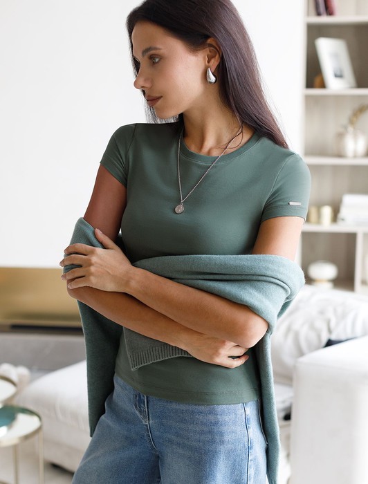 Состав: 92%Хлопок 8%ПУ Плотность: 170 Г/м2 Параметры модели на первом фото: Рост 172, бюст 88, талия 64, бедра 88Футболка выполнена из премиального хлопка, дополнена металлическим логотипом бренда на рукаве.Модель идеально сидит по фигуре не сковывая движения. Хлопковый трикотаж поддерживает оптимальную температуру тела, поэтому в изделии будет комфортно в течении всего дня. Наличие эластана в составе гарантирует формоустойчивость. Базовая модель впишется в повседневные образы и подойдет для офисного дресс-кода.