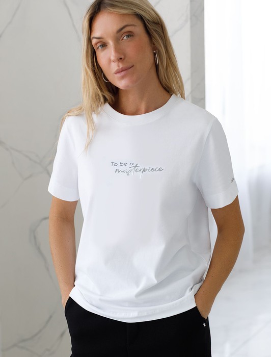 Футболка выполнена из премиального хлопка. Авторский принт нанесен фактурными красками с устойчивым покрытием. Наличие эластана в составе гарантирует комфорт и формоустойчивость. Изделие дополнено фирменным металлическим логотипом бренда.