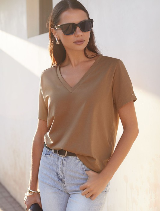 Состав: 92%Хлопок 8%ПУ Параметры модели на первом фото: Рост 170, бюст 89, талия 63, бедра 92 Размер товара на первом фото: 42Футболка выполнена из премиального хлопка. Базовая модель с V-вырезом впишется в любой гардероб в любом сезоне. Наличие эластана в составе изделия гарантирует комфорт и формоустойчивость. На рукаве металлический логотип бренда.