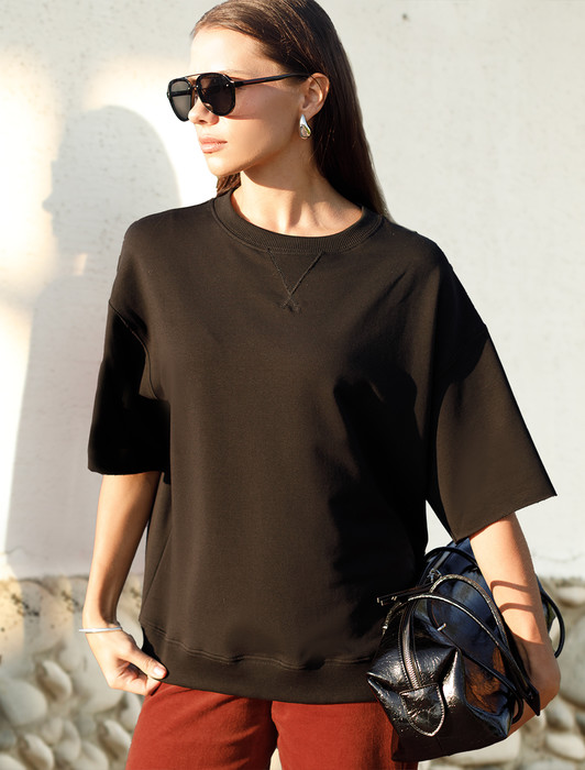 Состав: 95%Хлопок 5%ПУ Параметры модели на первом фото: Рост 172, бюст 88, талия 64, бедра 88Футболка свободного кроя со спущенным плечом выполнена из футера двухнитки с эластаном. Лаконичный принт нанесен фактурной краской. Эластичный материал гарантирует комфорт и формоустойчивость. Сочетается в костюме с брюками D44.138, D44.139 и шортами D48.008. Изделие дополнено металлическим логотипом бренда.
