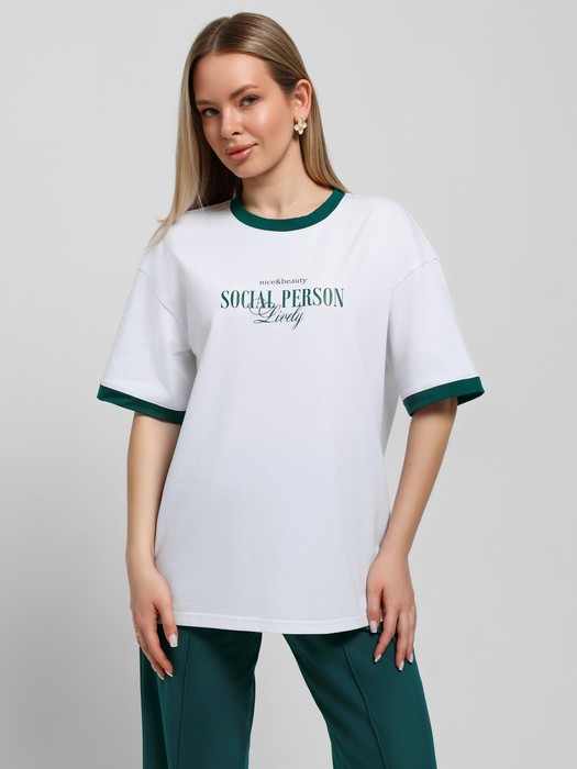 Футболка молодежная из трикотажного полотна «кулирка с лайкрой» свободного покроя, горловиной овальной формы, короткими втачными рукавами. Планка горловины и манжеты на рукавах выполнены из контрастного материала, на полочке принт, выполненный в технике «шелкографии».