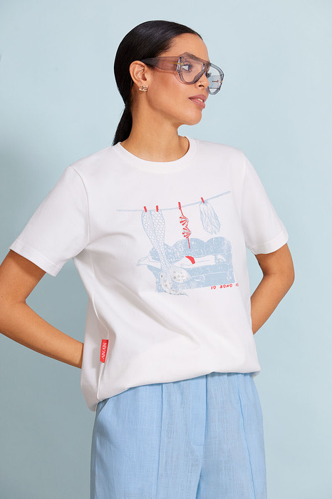 Объемная футболка оверсайз выполнена из плотного хлопкового трикотажного полотна (интерлок). Спущенная линия плеча. Рукав до локтя. Горловина круглая с притачной планкой. Дизайнерский принт “ Русалка” на передней половинке футболки.