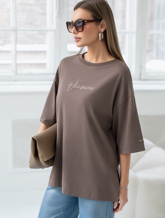 Состав: 92%Хлопок 8%ПУ Плотность: 170 Г/м2Оверсайз футболка кофейного цвета с из премиального хлопка с добавлением эластана создана для комфорта и стиля каждый день. Натуральный материал приятный к телу, дышащая ткань хорошо держит форму и подходит для повседневной носки дома, в офисе или на прогулке. Классический свободный крой, удлиненный прямой силуэт и свободная посадка делают эту базовую футболку универсальным решением для любой фигуры и роста, включая плюс сайз размеры и беременных девушек, отлично скроет животик. Широкие рукава держат форму и подойдут на полные руки. Нарядная футболка украшена авторским принтом в виде надписи блестящими стразами, которые создают красивый мерцающий эффект. Перевод надписи Whatever - Что бы ни... Такой акцент делает модель уместной как для особых случаев, так и для ежедневных образов.