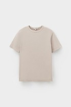 Модель прямого силуэта, со спущенным плечом. Горловина обработана бейкой. По низу футболки ассиметричные складки и декоративная брошь.