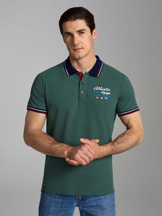 Футболка-поло из хлопкового полотна "пике". Классическая модель поло с короткими рукавами. Воротник и манжеты рукава выполнены из трикотажной рибаны темно-синего цвета с красно-белой полосой. На полочке застежка-планка на пуговицах. На нижней планке и по горловине настрочена контрастная киперная тесьма. На полочке вышивка "Atlantic Sailing Voyage" и флаги. По низу футболки в боковых швах выполнены разрезы, обработанные тесьмой. С правой стороны полочки, по низу настрочен жаккардовый "флажок" с логотипом.